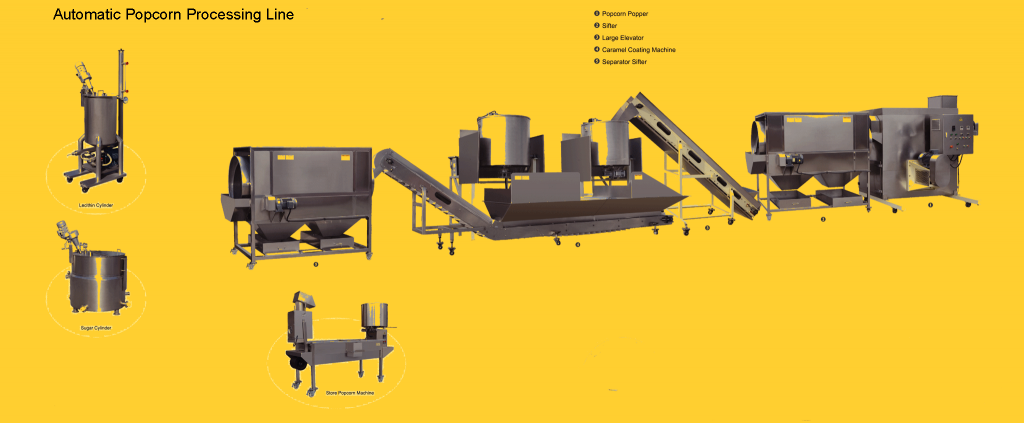 Popcorn Machine → Conveyor → Rotary Sifter → Elevator → Flavoring Line → Conveyor → Rotary Sifter